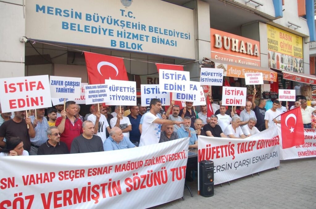 Mersin’de CHP’li Mersin Büyükşehir Belediye Başkanı Vahap Seçer tarafından ısrarla yıkılmak istenen ve mahkeme tarafından yürütmeyi durdurma kararı verilen tarihi Zafer Çarşısı önünde bir araya gelen çarşı esnafı, CHP’li Seçer tarafından ısrarla ekmek teknelerinin yıkılmak istenmesine tepki gösterdi. ‘Rızık Kutsaldır’ yazılı pankartlarla bir araya gelen çarşı esnafı, 4 yıl daha kontratları olduğunu belirterek, “Davalarımız henüz devam ederken, biz sokağa atılmak isteniyoruz. Lütfen sözünüzü tutun. Esnafı sokağa atmak mağdur etmek size bir şey kazandırmaz. Esnafı karşınıza almak sadece size kaybettirir” dediler.