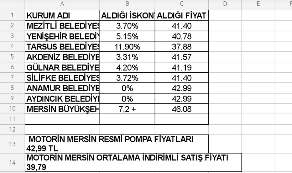 Bizim ilçelerimiz olan Yenişehir Belediyesi, Tarsus Belediyesi, Mezitli Belediyesi, Akdeniz Belediyesi yakıtı indirimli alırken hatta Tarsus Belediyesi litresini 37 liradan alırken Mersin Büyükşehir Belediyesi 46 liradan alıyor.