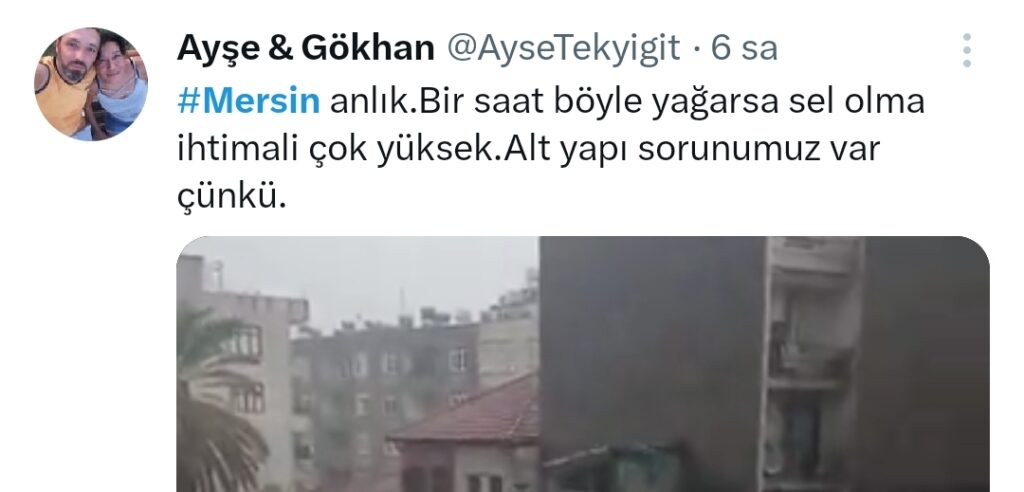Sosyal medyadan tepkilerini dile getiren vatandaşlar, “Anlık Mersin. Bir saat böyle yağarsa sel olma ihtimali çok yüksek. Altyapı sorunumuz var çünkü” dedi.